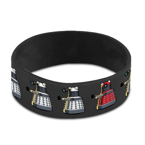 -. Feature : This Doctor Who Dalek Repeat Gray Rubber Wristband is the perfect accessory for any Doctor Who fan! / It features a bunch of images of Daleks all around it. / Get the other wristbands and see how many of your favorite Doctor Who slogans and motifs you can collect!