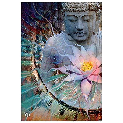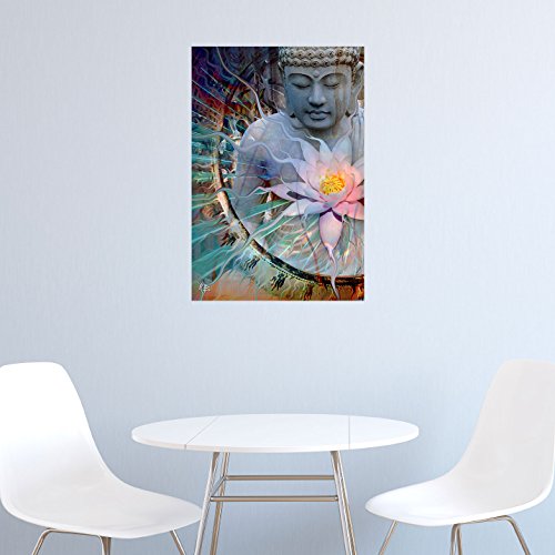 Psychedelically stunning! This beautiful zen inspired wall decal, Living Radiance by artist Christopher Beikmann combines photo imagery with a psychedelic flare giving this visually stimulating wall decal a harmonious vibe. This gorgeous mixed media wall decal features a pink lotus flower blossoming atop a Buddha statue as he rests in a meditative position against a multi colored background encircled by a rustic ring of tiny hands in the vikarka mundra position. Hues of teal, blue, and red beam like sun rays from behind the Buddha statue and flower while calming hues of pink and lavender branch out from the petals of the lotus blossom in viney swirls making this Buddha wall decal both vivid and tranquil. Living Radiance is available in 4 sizes: S-10"w x 14.85"h; M-14.85"w x 21.85"h; L-26.5"w x 39"h; XL- 39"w x 57.5"h. Perfect for walls, mirrors, doors, windows - easy installation guaranteed! Our wall decals will easily peel and stick to any flat surface, as they are made with SafeCling, a high-quality polyester fabric material that is mess-free, removable, repositionable and eco-friendly. This ethereal inspired digital photo collage decal will look great on the walls of your home, yoga studio, or bohemian shop. Living Radiance makes a great gift for surreal art lovers too! Please contact us at 888-945-4443 if you have any questions or simply want to talk wall decor. We are happy to help!Feature