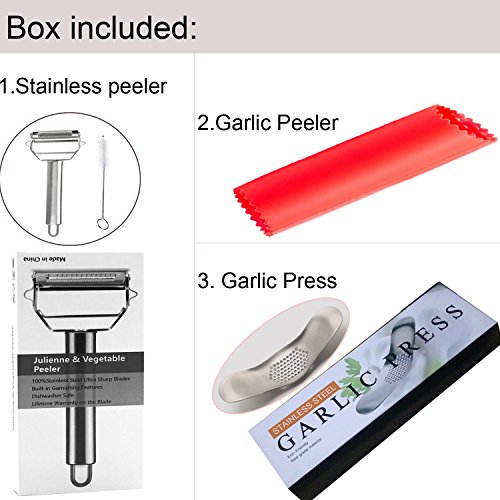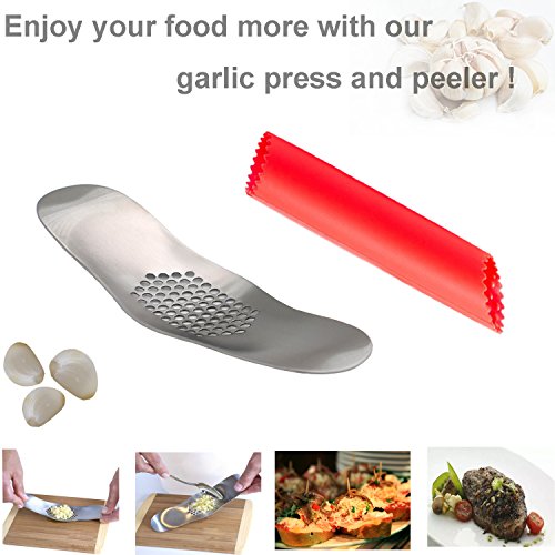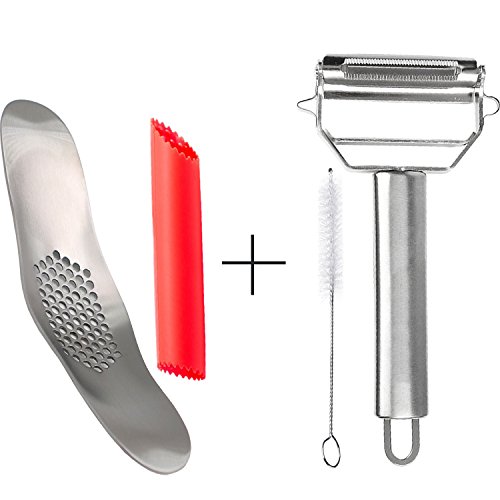 Garlic Press Set and Vegetable Peeler/Slicer—Food Grade 304 Stainless Steel Garlic Squeezer Mincer and Silicone Tube Peeler—Cleaning Brush Included