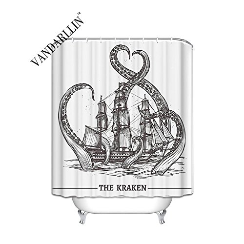 Nautical Decor , Giant Octopus Catches Old Style Sail Ship Monster (The Kraken) Polyester Fabric Bathroom Shower Curtain, 84 Inches Extra Long, Black And White