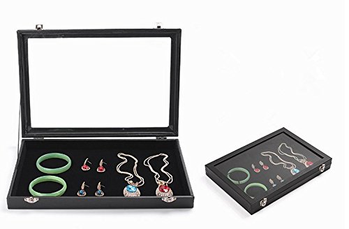 Glass Top Black Jewelry Display Tray Organizer for Jewels, Rings, Necklaces, Bracelets, Protects Jewelry, Stackable