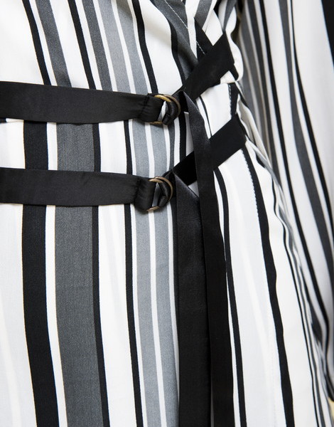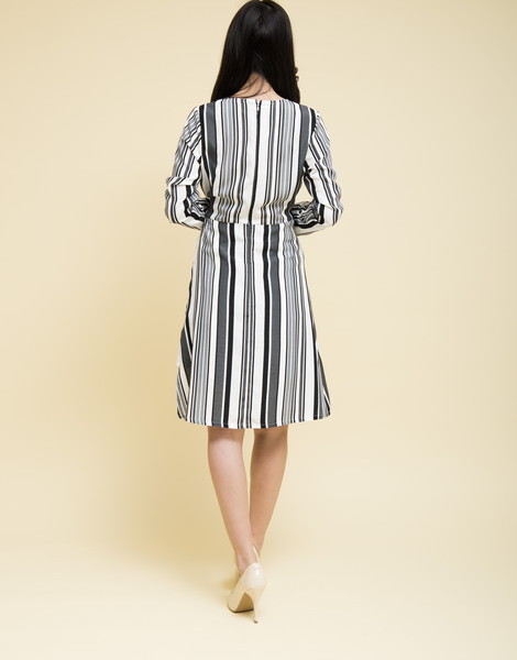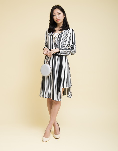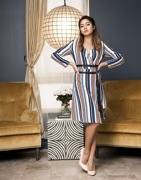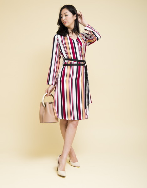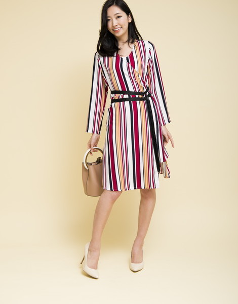 マルチカラーのストライプが知的な雰囲気を演出するワンピース。深めのVネックでデコルテがすっきり見えます。ウエストマークの細ベルトデザインでスタイルアップを叶えてくれる優秀アイテム◎