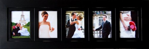 Our Collage Picture Frames with five 5x7 openings are handcrafted from solid wood and hand-painted and hand-distressed to give you a truly elegant look that works with almost any decor. This multi-opening, multi-picture frame set is perfect for a grouping of up to five of your favorite photos. Display your favorite memories and favorite people all in the same place. Exterior Frame Dimensions are 12"H x 36"W x .75"D. Outer frame is 2.75 inches wide. Made in the USA, this collage multi picture frame includes glass, backing and hanging hardware. Can be hung horizontally or vertically.Feature