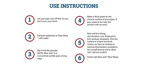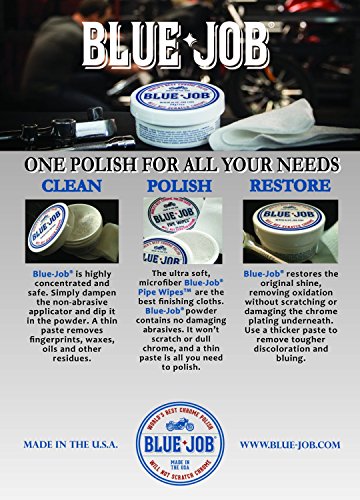 -. Brand : Blue-Job -. EAN : 5060196433988 -. Feature : Blue-Job Chrome Polish has a unique non abrasive, highly concentrated, powder formula / Guaranteed to remove exhaust bluing and add a long lasting shine / Claims to be the "World's Best Chrome Polish" / New bigger 1oz (28g) tub, super concentrated powder / Apply using a damp cloth - a little goes a long way -. Label : Blue Job -. Manufacturer : Blue Job -. ManufacturerPartsWarrantyDescription : Parts -. MPN : 3702-0006 -. PackageQuantity : 1 -. PartNumber : 3702-0006 -. ProductGroup : Automotive Parts and Accessories -. ProductTypeName : AUTO_ACCESSORY -. Publisher : Blue Job -. Studio : Blue Job -. Title : Blue Job Chrome Exhaust Polish (Removes Exhaust Pipe Bluing) - 14g Tub