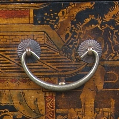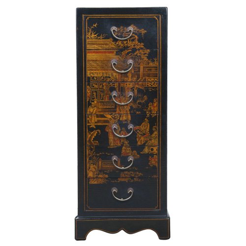 Studio : EXP Furniture Publisher : EXP Furniture Binding : Kitchen Product Description Enjoy the clever marriage of artistry and function which combine in this chest-of-drawers accent table inspired by antique Chinese furnishings. This handsomely crafted piece, hand-constructed by expert artisans in Guangdong Province, China, features a sturdy wooden frame ensconced in a thin layer of red leather stretched tightly around the frame. Hand-painted across the top and front surfaces are intricate courtyard scenes featuring characters garbed in brilliant shades of aqua, vermillion, gold and black. On the front surface, an officer is honored in a beautiful courtyard setting, while on the top surface courtesan women play traditional musical instruments. The sides of this artfully appointed accent piece are adorned with cranes, flowers and trees, ancient Chinese symbols of longevity and prosperity. A cascade of six drawers pull open to reveal tastefully lined storage space ideal for keeping lingerie, jewelry and other personal treasures. Slender antiqued iron pulls lend an elegant finishing touch to this Eastern masterpiece. With its stunning, detailed images, narrow profile and plentiful storage space, this beautiful work will be a cherished addition in any decor. Measures approximately 36 inches high x 14 inches wide x 12 inches long. AsiaEXP brings you handicrafts of exceptional quality from a variety of world cultures. With this purchase, you are not only receiving a beautiful product, you are also supporting a great cause. By shopping with us you help to sustain talented Asian artisans and to preserve the rich cultural heritage of East Asia. The handcrafted nature of this item will produce minor differences in design, color and sizing. Subtle variations will occur from piece to piece, adding to the unique quality of individual creations. Measurements may vary slightly. 0