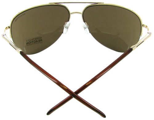 Kenneth Cole Reaction Men's Half Rim Aviator Sunglasses. These sunglasses feature a metal frame with a half rim design, plastic lenses, and adjustable nose pads. Arm length measures approximately 127 mm, bridge width measures approximately 14 mm, and the lens width measures approximately 63 mm.
