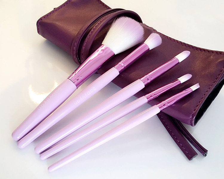 从左到右分别为:腮红刷,眼窝晕染刷,大眼影刷,小眼影刷,斜眉刷。