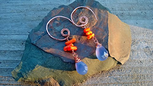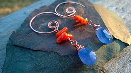 -. Title : Blue chalcedony and orange bamboo coral chips on hammered copper spiral dangle earrings
