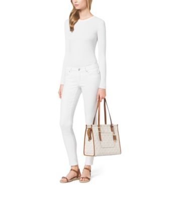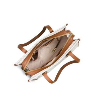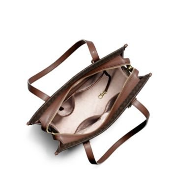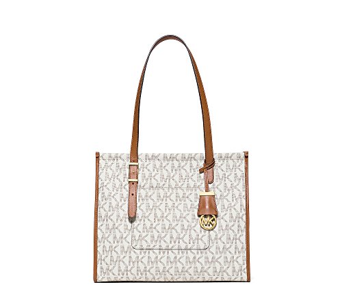 -. Brand : -. Department : women's -. Feature : MK Signature PVC; lining: polyester / Exterior features gold-tone hardware and 1 back slide pocket / Interior features 1 zip pocket, 4 utility pockets and key clip / 10-14"L double handles / 13" W x 11-1/4" H x 5-3/4" D -. ProductGroup : Shoes -. ProductTypeName : HANDBAG -. Size : Medium -. Title : MICHAEL Darien Medium Tote