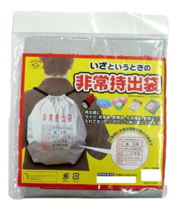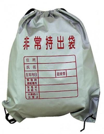 表面に災害時に大切な情報が書き込める非常持出袋。