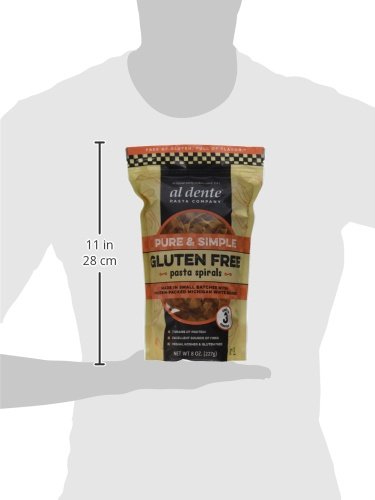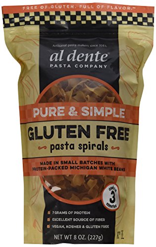 -. Binding : Grocery -. Brand : Al Dente -. EAN : 0081475385427 -. Feature : Made in small batches with locally grown white bean flour / High in protein (7 grams), rich in fiber (6 grams) / Certified gluten free, vegan, kosher and gmo free / Cooks in three minutes / Packaged in a resalable pouch -. Label : Al Dente Pasta Company -. Manufacturer : Al Dente Pasta Company -. MPN : 1687375 -. NumberOfItems : 1 -. PackageQuantity : 1 -. PartNumber : 1687375 -. ProductGroup : Grocery -. ProductTypeName : GROCERY -. PublicationDate : 2015-07-21 -. Publisher : Al Dente Pasta Company -. ReleaseDate : 2015-07-21 -. Studio : Al Dente Pasta Company -. Title : Al Dente Pure and Simple Gluten Free Pasta Spirals, 6 Count -. UPC : 081475385427
