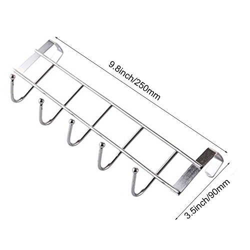 -. Feature : 5 hooks rack, made from high quality stainless steel material, durable, rust-free and environmental health. It doesn't need the nails and glue, can be used for a very long time. / No need to drill the wall, full protection for the wall. Very convenient to use and very easy to store when you don't use it. A very practical door hook rack for hanging towels, hats, bags and other things, help to build a clean and neat home environment. / The hook is suitable for door which is less than 0.78" / 20mm, you can remove it at any time if you don't need it without leaving any mark on the wall. It can bear less than 4.4 lbs / 2 kg. / Round head design to prevent damage to the clothing and hurt your hands. Safe and reliable, completely humanized design, best for family use. / Size: 9.8" x 3.5" / 250mm x 90mm.