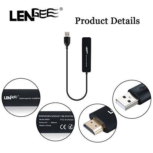 -. Binding : Electronics -. Brand : LENGEE -. EAN : 0723120413139 -. Feature : Support HDMI 1.4, 1080P full HD output / Support multi-screen interactive features like miracast. / External WiFi antenna for stronger signal transmission / Mini, small-size, lightweight, convenient for travel / The wifi wireless display dongle receiver allows you to easily share photos, music and videos from your mobile devices like smartphone, tablet, or PC to large screen like TV and prejector. -. Label : LENGEE -. Manufacturer : LENGEE -. MPN : 160118-F5 -. PackageQuantity : 1 -. PartNumber : 160118-F5 -. ProductGroup : PC Accessory -. ProductTypeName : NETWORKING_DEVICE -. Publisher : LENGEE -. Studio : LENGEE -. Title : LENGEE WD01 Intel WIDI Miracast WIFI Wireless Display Media Sharing Device HDMI Dongle TV Adapter for Windows 8 / Windows 10 PC / Tablet / Laptop -. UPC : 723120413139