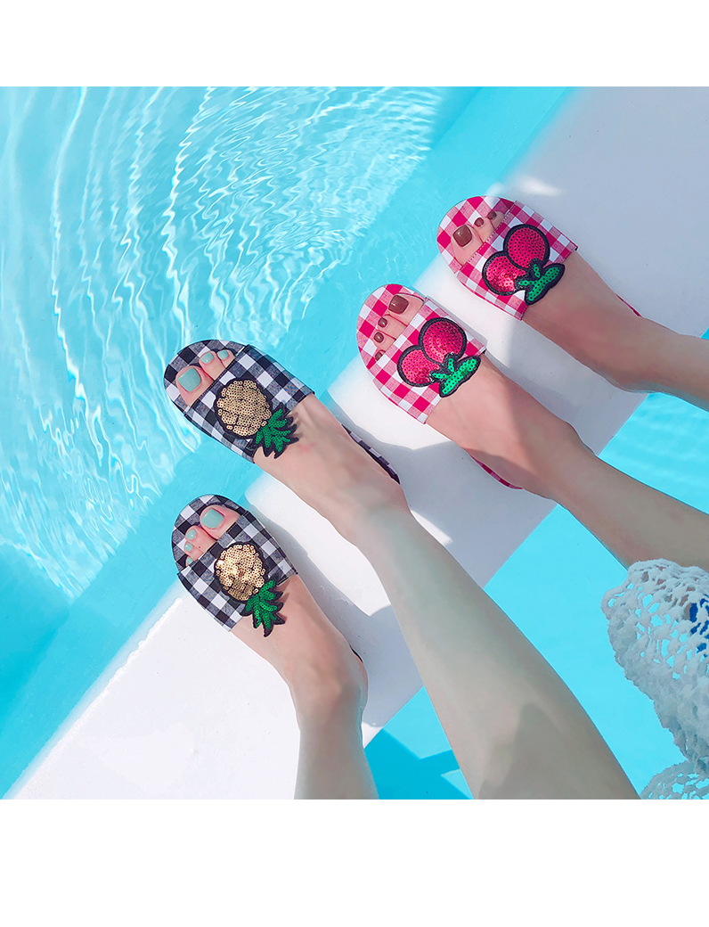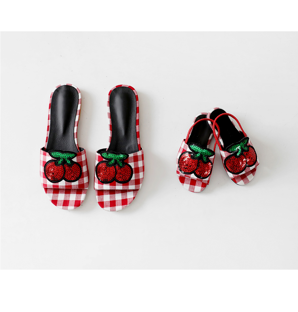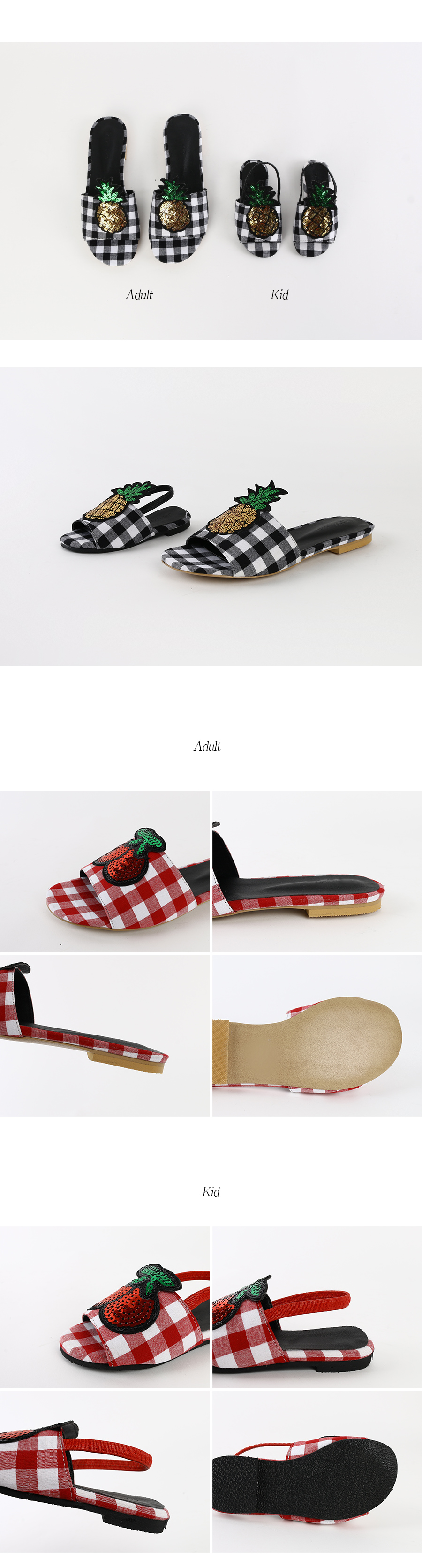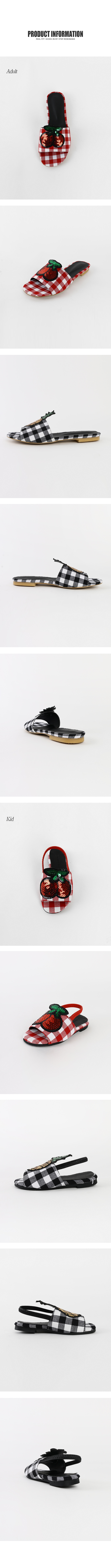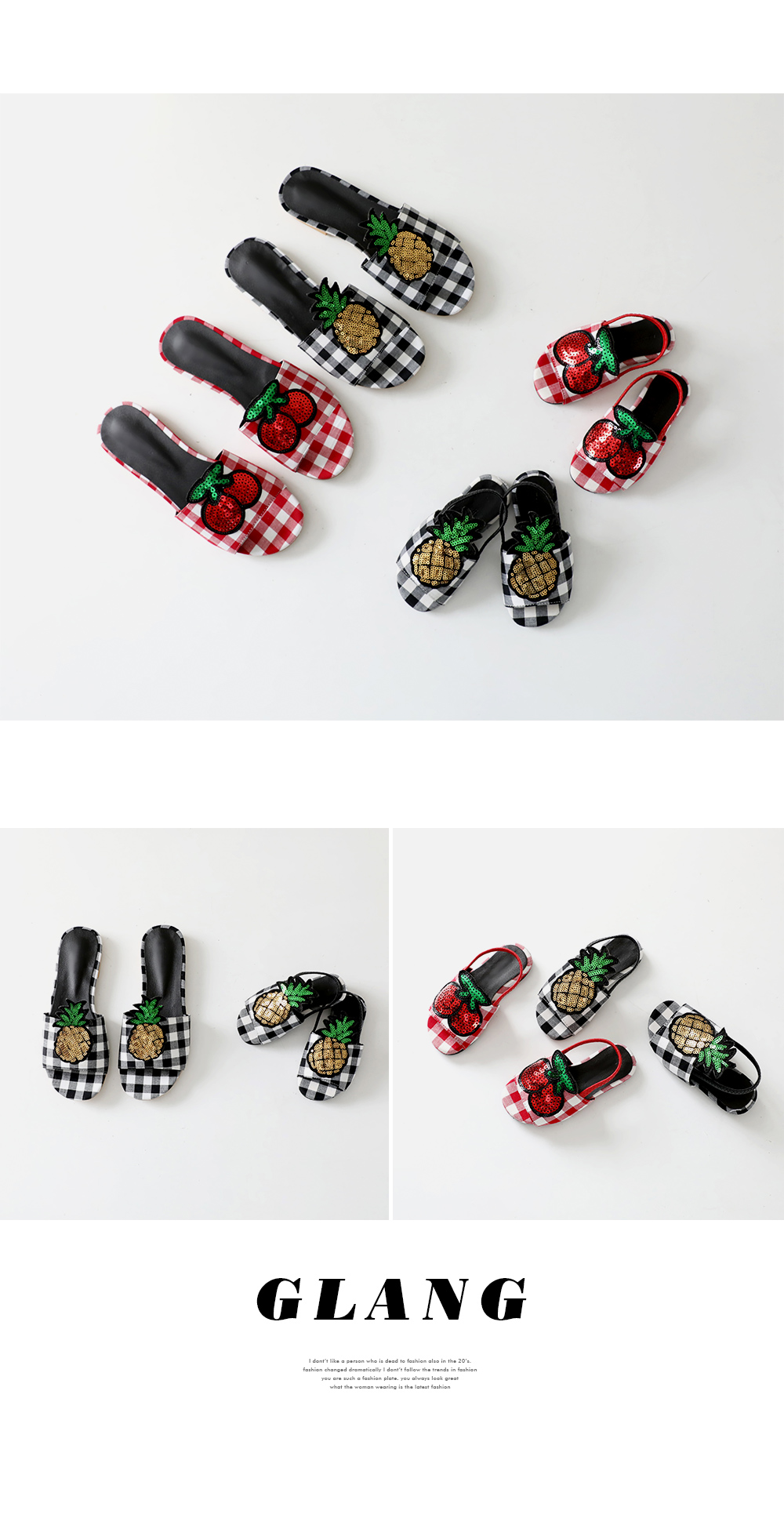 발등에 과일 스팽글디테일이 굉장히 귀여우면서 패브릭텍스쳐라 가죽제품보다는 통기성좋게 착화됩니다.