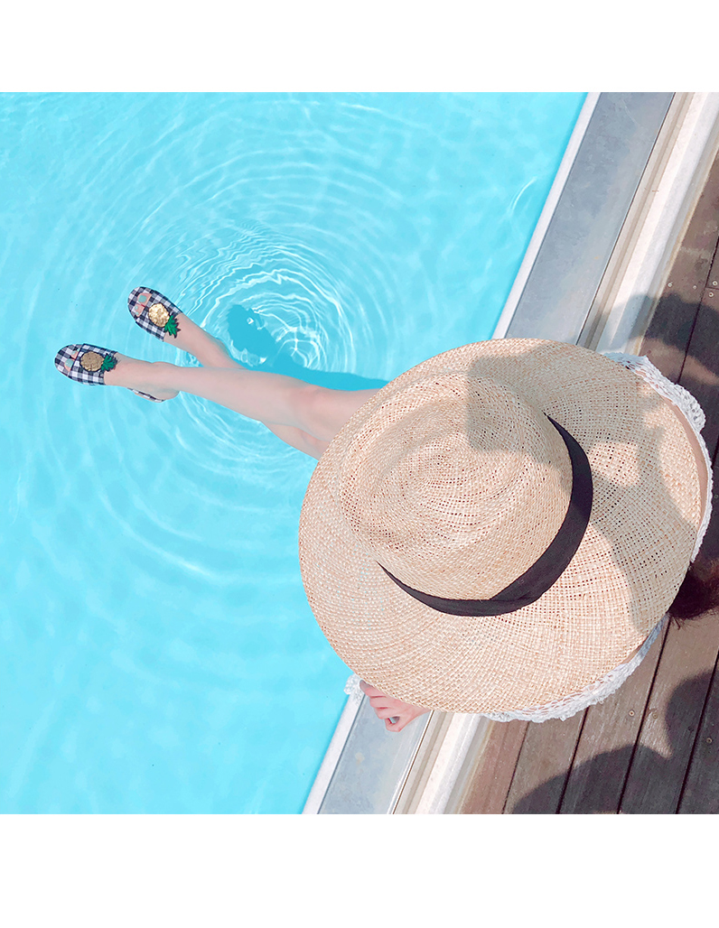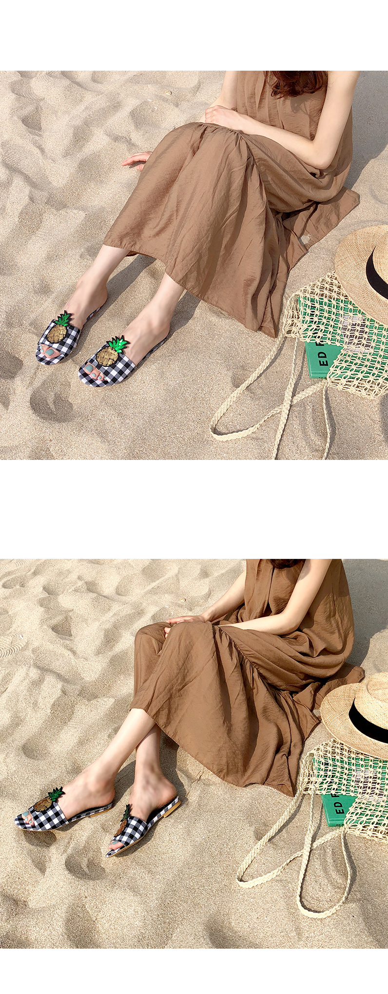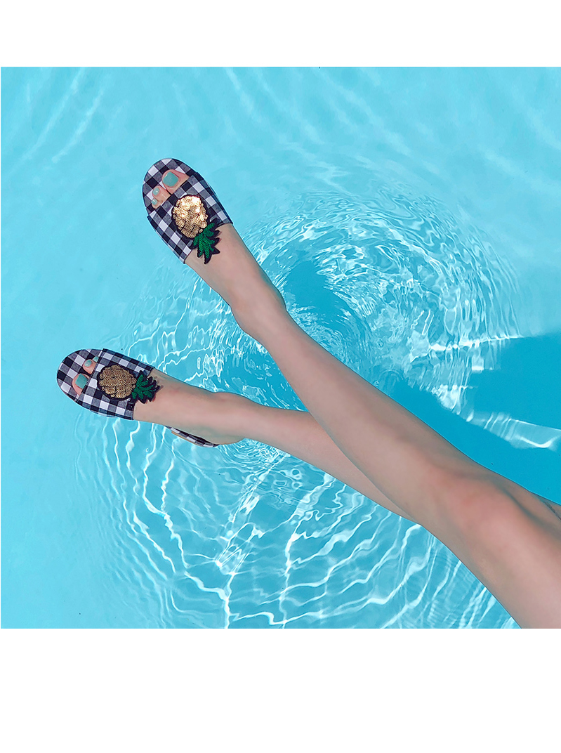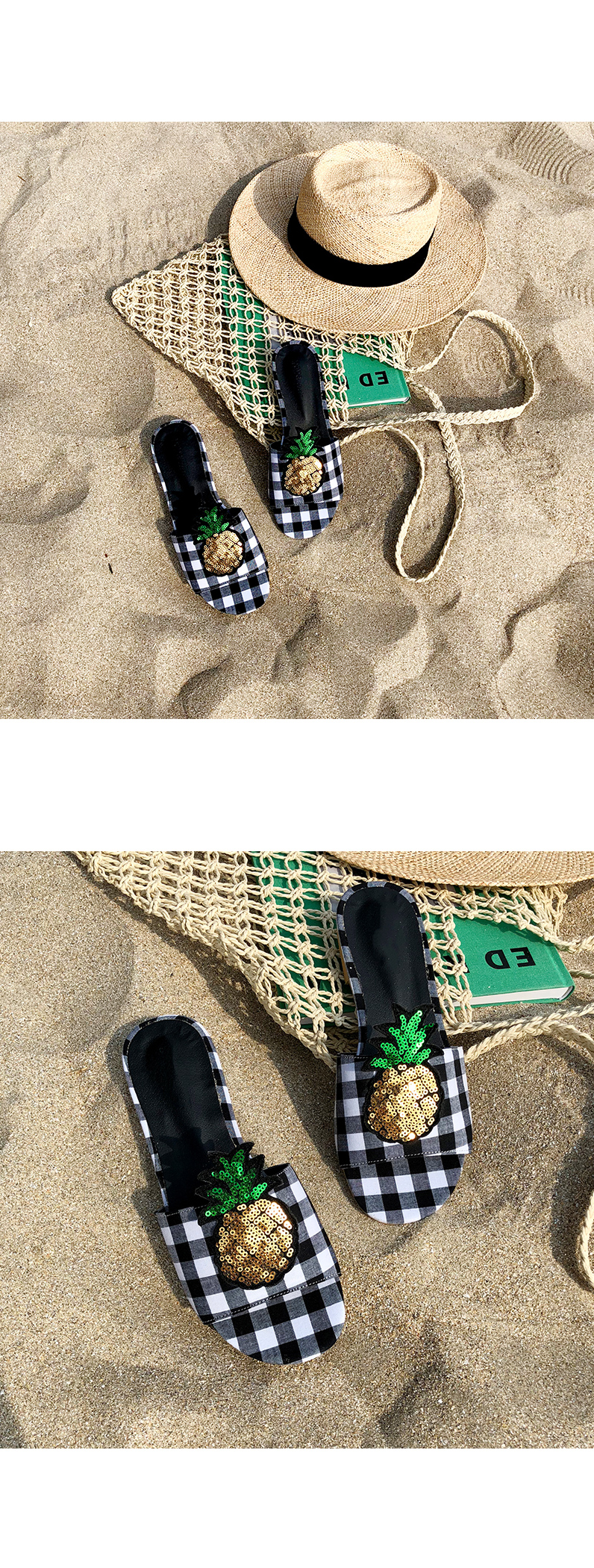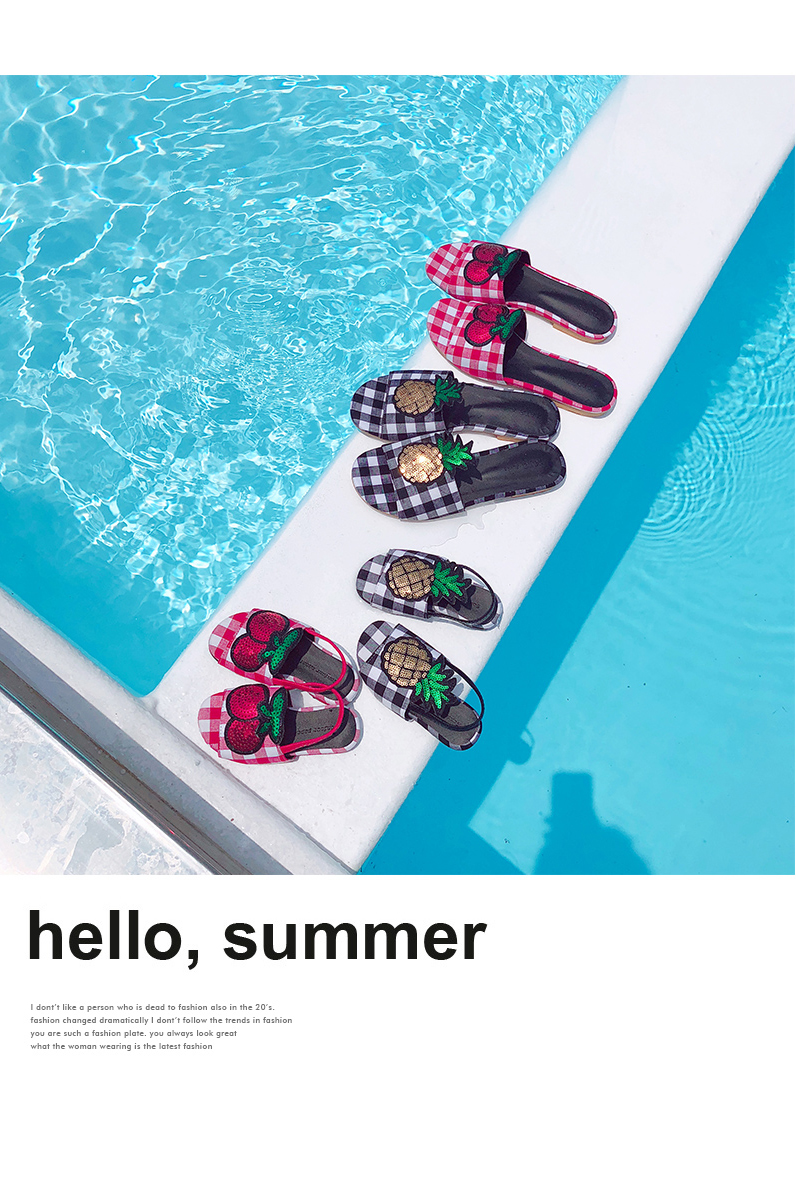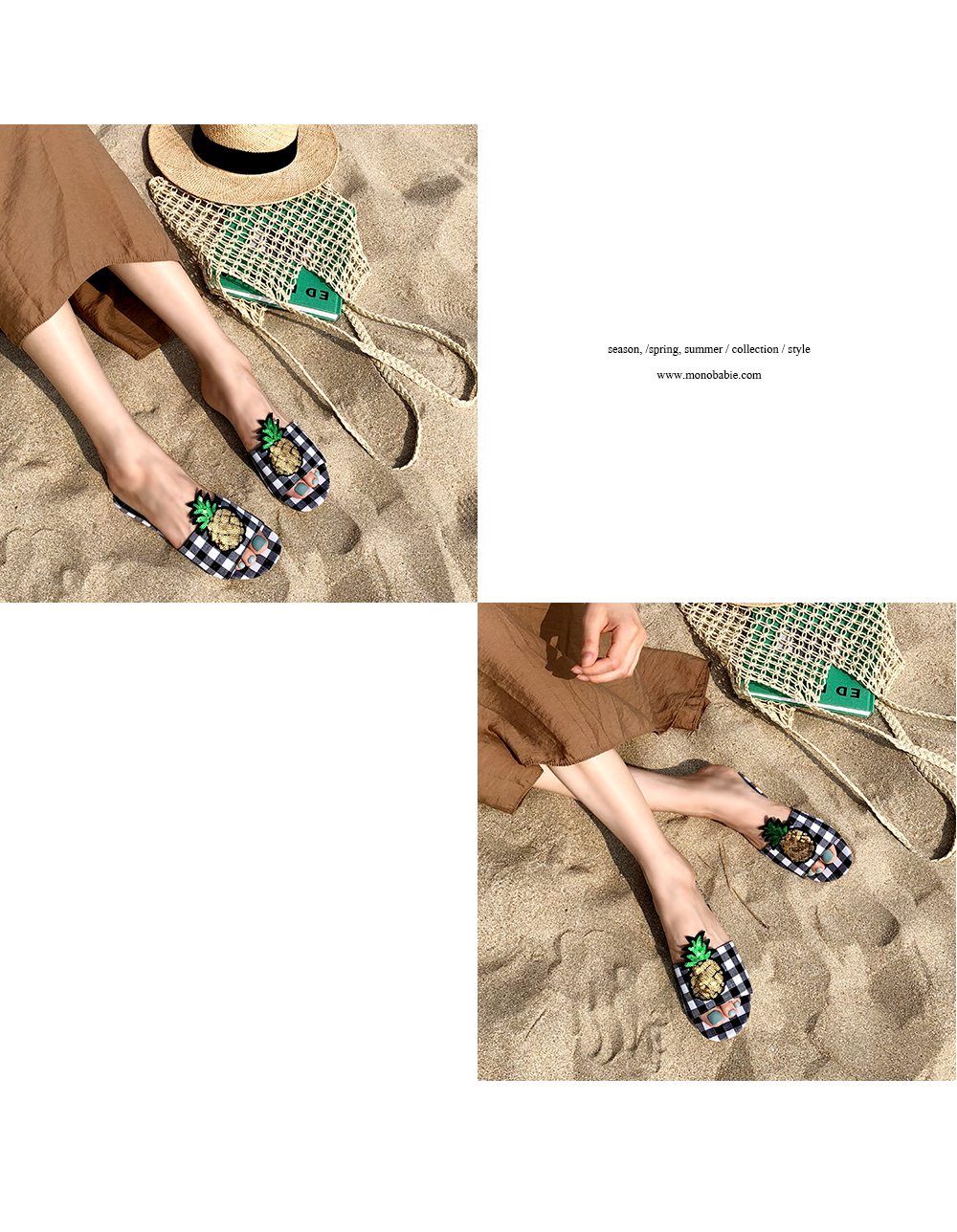 발등에 과일 스팽글디테일이 굉장히 귀여우면서 패브릭텍스쳐라 가죽제품보다는 통기성좋게 착화됩니다.