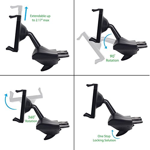 -. Feature : CD car mount is designed to fit vehicle's cd slot. Just add extra Three attachable clips(if necessary) onto the mount for perfect fit. / Easy mount using One Touch Lever,no need tools to mount your Smartphones front and center in your car and play CD simultaneously. / Full 360 degree rotation with two ball joints and tilt it for multiple angles - Vertically or Horizontally. Allows you to find that perfect viewing angle with one hand. / Stretchable clamp/bracket can hold up to 3.5 inch wide,rubber pad on clamp can protect your phone not damaged. / The mount securely keeps your smartphone where you need it most without obstructing your view; Always keep it stay in place.
