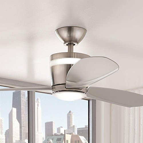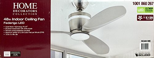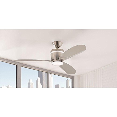 Award winning fixture design and lifetime durability this name brand ceiling fan is made to last a lifetime. This stunning and newly updated ceiling fan has even more durable materials, quiet motor technology and LED lighting. This amazing combination of features will beautify your home and saver energy for many years to come.Specifications Dimensions Assembled Depth (in.): 48.00 in Downrod Length (in.): 4.5 Assembled Height (in.): 12.91 in Fan Blade Length (In.): 48 Assembled Width (in.): 48.00 in Fan Blade Width (In.): 48 Ceiling Fan Width (in.): 48 Details Airflow (CFM): 5219 Light Type: Integrated Blade Color Family: Silver Motor Speed (RPM): 165 Bulb Type Included: LED Mounting Options: Standard Color Family: Nickel Number of Blades: 3 Commercial / Residential: Residential Number of Speeds: 3 Damp/Wet Rating: Dry Product Weight (lb.): 15lb Dual Fan Heads: No Pull Chain: No Features: Integrated LED, Reversible Motor Remote Control: Yes Fixture Color/Finish: Nickel Glass Style: Contemporary Reverse Airflow: Yes Housing Color Family: Nickel Reversible Two-Sided Blades: No Included: Downrod Included, Light Kit Included, Remote Control Included Timer: No Indoor/Outdoor: Indoor Certifications and Listings ETL ListedFeature