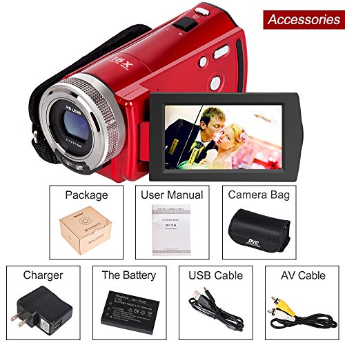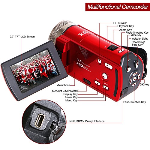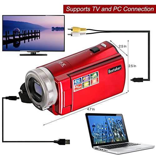 Besteker Camcorder: High quality 1280*720P 30 FPS digital video camcorder. 2.7 inches TFT-LCD screen(supports 270 degrees rotation). 16X digital zoom.