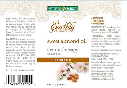 ReleaseDate : 2015-12-07 Studio : Nature's Bounty Publisher : Nature's Bounty Binding : Health and Beauty Product Description Nature's Bounty Earthly Elements Sweet Almond Oil is the perfect base ingredient for any aromatherapy recipe. Sweet Almond Oil is a natural vegetable oil with a neutral aroma that makes it ideal for blending, because it won't overpower other fragrances. Since many aromatherapy oils are too concentrated to apply directly to your skin, Sweet Almond Oil is the perfect companion oil. It helps dilute these concentrated oils in a nourishing, soothing base, and ultimately leave your skin smooth and touchably soft. Simply mix Sweet Almond Oil with your favorite scented aromatherapy oil, and apply it to your skin for a refreshing massage. 0
