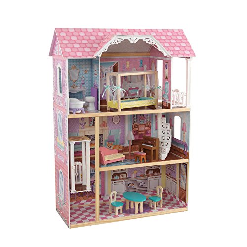 -. Feature : KidKraft Charming Chateau Dollhouse / 3 floor house with 4 spacious rooms, windows, elevator, and balcony / Accessories that light up and have sound effects / Moving elevator tall enough to accommodate 12 inch dolls / 10 pieces of furniture including: poster bed, chaise lounge, lamp, piano, piano bench, table, 2 chairs, toilet, and tub