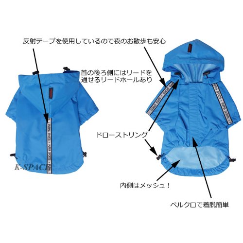 ●防水加工●素材:外側ナイロン 内側メッシュ●腕と背中に反射テープ●首の後部にリードを通すリードホールあり