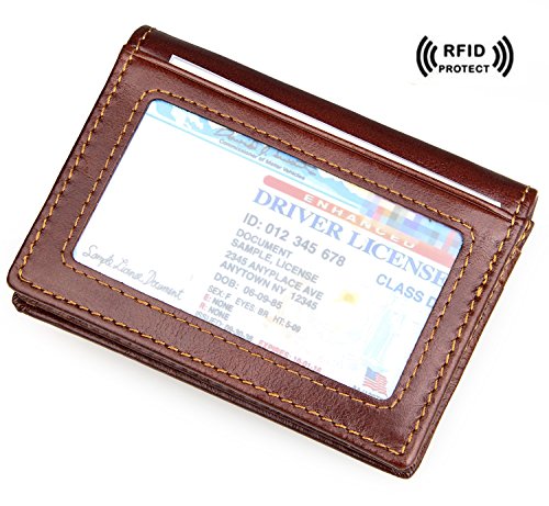 -. Feature : RFID Blocking ANTI-THEFT Function. Blocks signals from scanners used by thieves to steal your credit card information, Each sleeve slot is protected with RFID blocking materials / Made of Genuine Cowhide Leather. Durable and stylish, Comfortable to use. Great slim wallet for carrying your most frequently used Cards and Cash / Dimension:3(L)*4.1(H)inch / 7.5(L)*10.5(H)cm, 5*Card pocket,1*ID Window,1*Money pocket / Light! Small wallet fit for your front or back pocket.You can put cards,drive licence,a few money,notes and so on in it / Wonderful gift for you or your friends