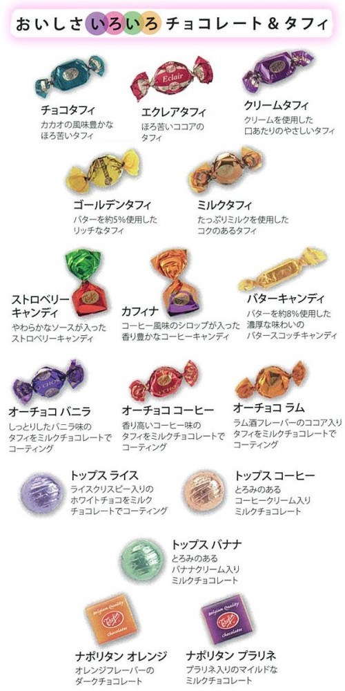 | 原材料 | 名称:キャンディ、チョコレート菓子、チョコレート 【キャンディー】砂糖、グルコースシロップ、植物油脂、加糖練乳、バターオイル、加糖脱脂練乳、食塩、ココアパウダー、麦芽エキス、糖みつ、りんごピューレ―、乳化剤、香料、酸味料、炭酸Ca、ゲル化剤(ペクチン)、炭酸水素Na、pH調整剤、(原材料の一部に大豆を含む) 【チョコレート菓子】砂糖、グルコースシロップ、全粉乳、ココアバター、植物油脂、加糖練乳、カカオマス、バターオイル、ココアパウダー、食塩、コーヒーペースト、乳化剤、香料、ソルビトール、酵素、(原材料の一部に大豆を含む) 【チョコレート】砂糖、カカオマス、ココアバター、全粉乳、植物油脂、ライスクリスプ、ヘーゼルナッツペースト、グルコースシロップ、ココアパウダー、乳化剤、香料、ソルビトール、(原材料の一部に大豆を含む) |