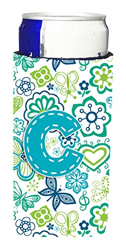 Letter C Flowers and Butterflies Teal Blue Ultra Beverage Insulators for slim cans CJ2006-CMUK