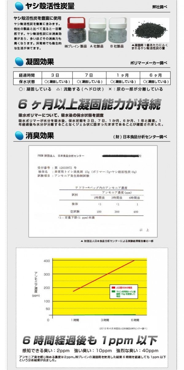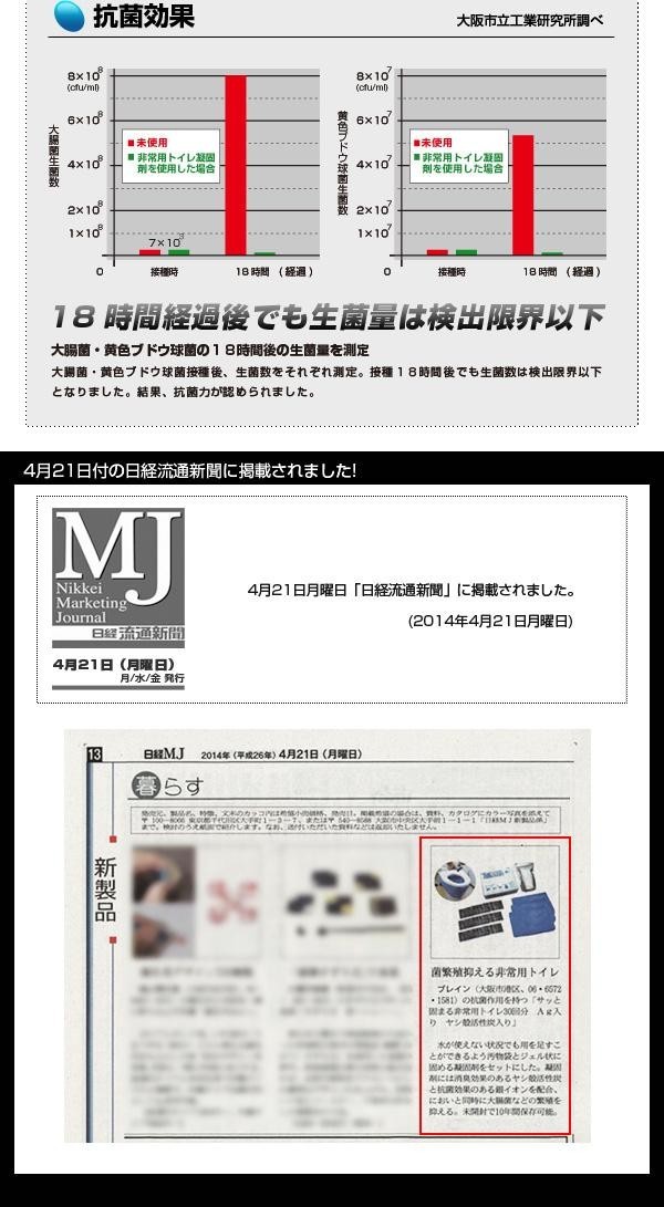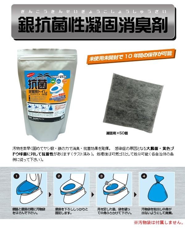 | 水が使えない状況でも汚物袋(別売)をかぶせるだけで用を足すことができます。使用後に凝固剤をふりかけるだけで、ジェル状に固まりゴミとして廃棄可能です。銀イオンを配合しているので抗菌作用があり、感染症の原因となる大腸菌や黄色ブドウ球菌の繁殖を抑えます。ヤシ殻活性炭を配合。消臭効果があり快適に使用できます。 |