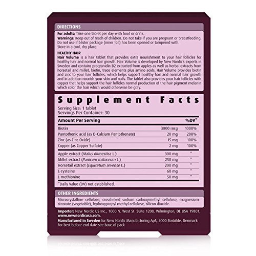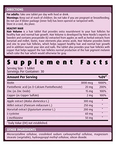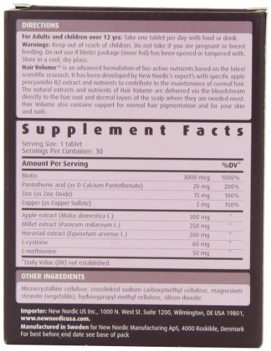 -. Binding : Misc. -. Brand : New Nordic -. EAN : 6902876874232 -. Feature : Made with all organic ingrdients, free of nasty chemicals. / Look the way you want to feel, and feel the way you want to look. / Live fabulously and with confidence. -. Label : New Nordic -. Manufacturer : New Nordic -. MPN : 741805747119 -. PackageQuantity : 1 -. PartNumber : 741805747119 -. ProductGroup : Beauty -. ProductTypeName : BEAUTY -. Publisher : New Nordic -. Studio : New Nordic -. Title : New Nordic Hair Volume, 30 Count (Pack of 3)