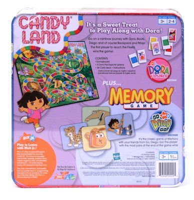 -. Binding : Toy -. Brand : Hasbro -. Color : Multi-color -. EAN : 0653569202295 -. IsAdultProduct : 0 -. Label : Hasbro -. Manufacturer : Hasbro -. MPN : 53678 -. PartNumber : 53678 -. ProductGroup : Toy -. ProductTypeName : TOYS_AND_GAMES -. Publisher : Hasbro -. Studio : Hasbro -. Title : Candy Land Nick Jr. Dora the Explorer Collectors Tin Edition Plus Go Diego Go! Edition Memory Game -. UPC : 653569202295