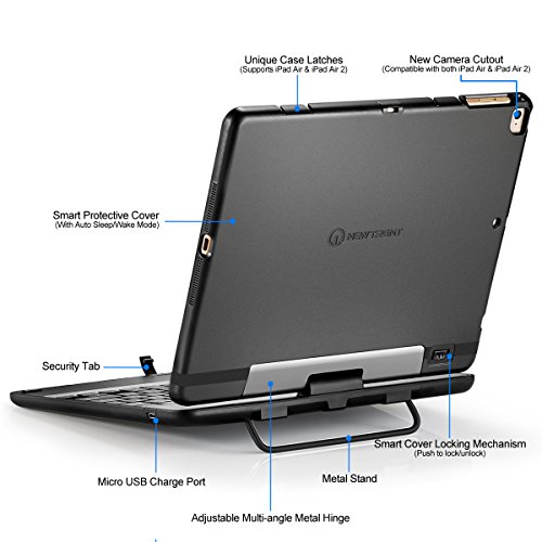 *** Upgrade Complete *** | Introducing the Airbender Star, the upgraded wireless Bluetooth keyboard case designed specifically for your iPad Air/Air 2. Stylish design, well-rounded protection with a reliable Bluetooth connection all compacted into a lightweight design weighing just 2 lbs with the iPad installed. Enjoy your iPad Air a little more, even when you are out and about! | *** 360 Degree Revolution ***| Adjust 360 Degree viewing angles and orientation to your heart's desire with the Airbender Star's rotational hinge design. Its new metal foldable handle stand can help produces 90 to 150 degree stable tilting angles as well as for travel. | *** Spacious Typing *** | Taking what we know about keyboard design and adding more spacious, chiclet keys for a satisfying and tactile typing experience. Let's not forget the simplicity of the pairing process via Bluetooth for consistent connectivity of up to 30 feet away. With productivity maximized, touch typists rejoice! | *** Keyboard Specifications ***| Input: 5V@1A | Bluetooth connection: Range of 30ft or 10m | Dimensions: 9.6 x 7.6 x 0.9 inches | Be sure to find the official New Trent logo to ensure a 10 months warranty.Feature