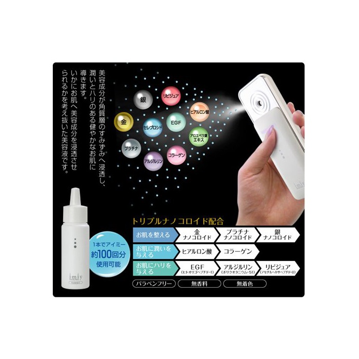 사용 방법:본체의 뒤편의 탱크에 화장 물을 넣고,겉쪽의 커버부를 아래에 슬라이드 시키면 전원이 들어감분 무개시합니다.또한위에 슬라이드 하게 해 되돌리면 전원이 끊어집니다.전원을 끄지 않아도 30 초다음에 자동 정지하는 안심 설계입니다.