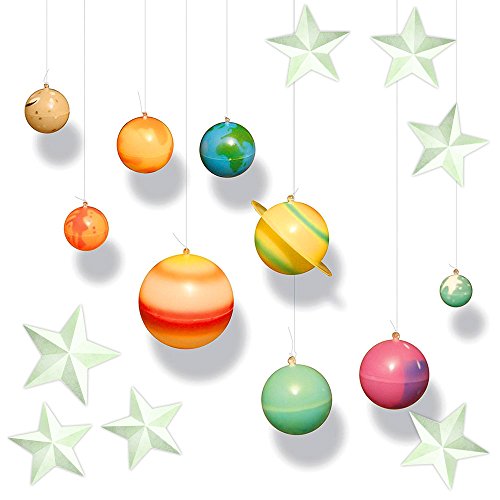-. Binding : Toy -. Brand : Glow In The Dark Planets -. Color : planets, stars -. Department : girls -. EAN : 0600292681262 -. Edition : Glow In The Dark Planets -. Feature : Edu Science Glow In The Dark Planets and Stars Room Decor Ultimate Set for Kids / Toddler Room -- Complete 3-Dimensional Planet System and Stars. / Includes complete glow in the dark planet system -- the perfect space room decorations. Turn any room into a glowing landscape with Saturn, Jupiter and all of the other planets. Bright colorful planets -- the ultimate glow in the dark room decor. / Includes all 8 planets -- 3-D design -- hang from the ceiling or create your own planets mobile. Includes mounting materials. Great glow in the dark space room and party decorations and party supplies. / Includes 30 large 3-D glow in the dark stars -- a great addition to any skyscape. / This glow in the dark planets and stars set is the perfect addition to any kids or toddler room decor or glow in the dark themed birthday party. Officially licensed glow in the dark toys. -. Genre : Glow In The Dark party supplies -. IsAdultProduct : 0 -. ItemPartNumber : Glow in the Dark Planets -. Label : University Games -. Manufacturer : University Games -. MPN : Planets for Kids -. PackageQuantity : 2 -. PartNumber : Planets for Kids -. ProductGroup : Toy -. ProductTypeName : TOYS_AND_GAMES -. Publisher : University Games -. Studio : University Games -. Title : Edu Science Glow In The Dark Planets and Stars Set Kids Toddlers -- 3-D Planet System and Stars (Glow In The Dark Space Room Decorations, Ceiling Walls) -. UPC : 600292681262