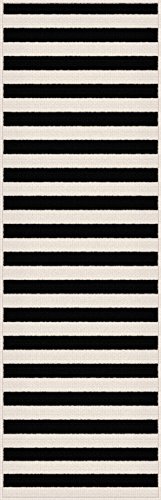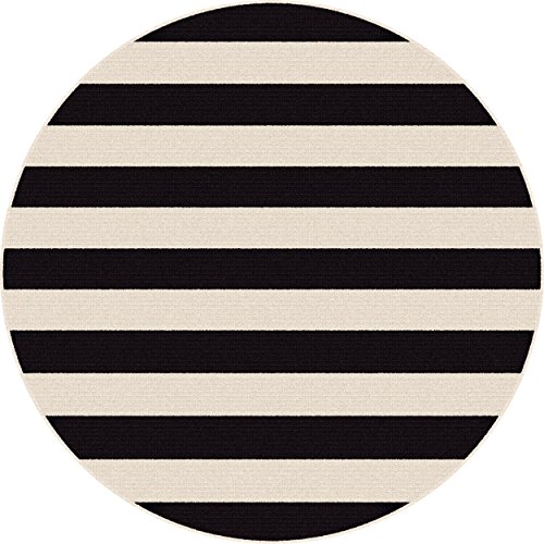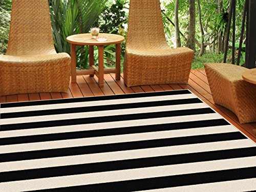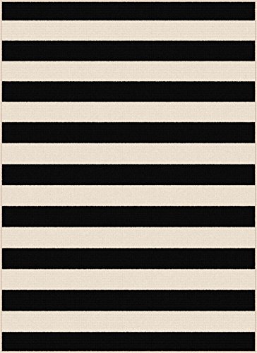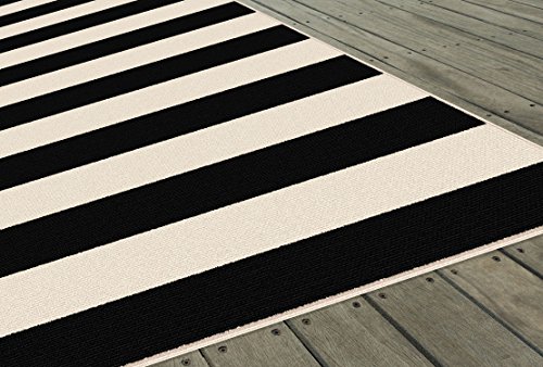 Add a touch of drama to your respite with this bold cabana stripe area rug. Weather-Resistant polypropylene fibers keep this rug looking great for years to come. Perfect for an outdoor room or sunroom. The simple design can be used with many styles of décor. Black and cream.Feature
