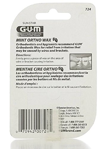 -. Binding : Health and Beauty -. Brand : GUM -. EAN : 0755332068661 -. Feature : Butler G-U-M Orthodontic Wax, Mint / Healthy gums. Healthy life. With vitamin E and Aloe Vera. Relieves irritation from braces. Orthodontists and hygienists recommend GUM Orthodontic Wax for relief from irritation that may be caused by wires and brackets. / Firmly press a piece of wax on the area of wire or bracket causing irritation. -. IsAdultProduct : 0 -. Label : SUNSTAR AMERICAS INC -. Manufacturer : SUNSTAR AMERICAS INC -. MPN : 724R -. PackageQuantity : 1 -. PartNumber : 724R -. ProductGroup : Health and Beauty -. ProductTypeName : HEALTH_PERSONAL_CARE -. Publisher : SUNSTAR AMERICAS INC -. Studio : SUNSTAR AMERICAS INC -. Title : Butler G-U-M Orthodontic Wax, Mint by GUM -. UPC : 070942004572