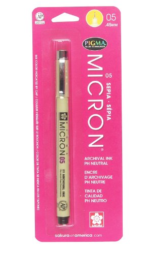 When accuracy, minute details and preservation count, the unparalleled archival quality of pigma micron pens makes them everyone's first choice. Artist, writers and illustrators reach for pigma micron and know their work is safeguarded with the permanence of pigma ink. Experience smooth, skipfree writing and crisp ink colors that leave consistent lettering and lines every time. It has achieved universal appeal and is carried by technical professionals, artists and crafters alike anthropologists, entomologists, scientists, research laboratories, archivists, architects, professional diamond cutters, cartoonists, manga and anime artists, illustrators, heirloom quilters and decorative fabric artists. Features archival quality ink for use in acidfree environments, chemically stable, waterproof, fade resistant, no smears, feathers or bleedthrough on most papers. Applicable for graphic art, scrapbook, archival recording, pen and ink illustrations, freehand art, rubber stamps, cartooning and fabric design. Technical qualities are archival quality pigma ink, six point sizes, no smear or feather when dry, waterproof and chemical proof, fade resistant, does not bleed through most papers, meets astm and acmi nontoxicity standard and not evaluated for cosmetic use on skin. Nib size for precise line width is 0.45mm. Available in sepia color.Feature