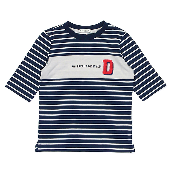비비드한 컬러감의 스트라이프 블록 7부티셔츠입니다. 가슴부분의 절개포인트에는 자수와 부클로 포인트를 주어 티셔츠 하나만으로도 스타일링에 포인트를 줄 수 있습니다.