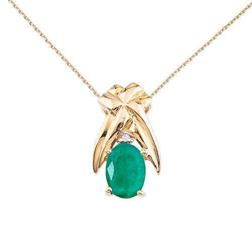 -. Title : 14k Yellow Gold 7x5mm Oval Emerald and Diamond Pendant with 18" Chain