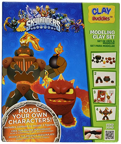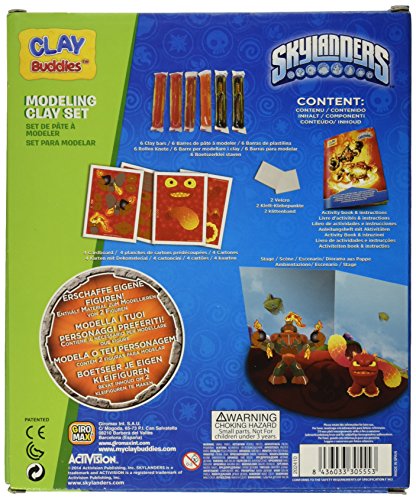 The Skylanders Clay Buddies are here! Your friends to mold have arrived. The real Skylanders Clay Buddies are now created with your own hands! Shape your favorite Skylanders characters! You can shape, have fun and complete your collection with the Skylanders Clay Buddies Starter pack with 6 modelling clay bars a big storybook where the kids will play with their own clay licensed clay buddy. In the box you will have also a scene to put your figurines and materials to create and mold 2 figurines. Instructions and Velcro included to mold your figure.Feature