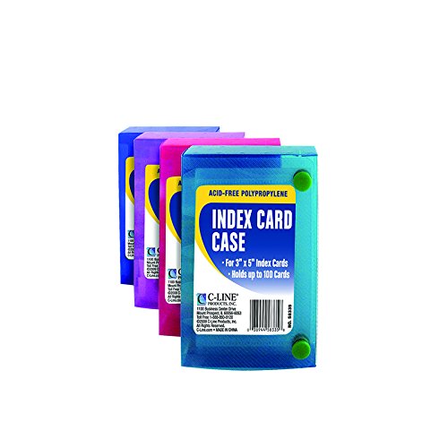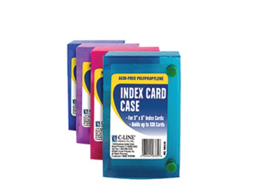 * Durable polypropylene card case holds up to 100, 3 x 5 inch index cards * Features snap closure and includes 5 dividers and adhesive label tabs * Acid-free, archival quality polypropylene * Assorted colors include blue, aqua, purple, pink