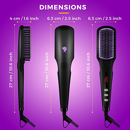 The size of the 2-in-1 hair straightening brush is 10,5", the handle is 5,5", and the head of the brush is 5". Voltage: 120V, 60Hz. The brush comes equipped with a double ionic generator, which makes your hair smooth, frizz-free and manageable.