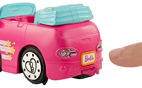 -. Feature : Barbie On the Go small doll and her cute convertible can really drive -- all on their own! / Push the button on the back of the pink car to start it rolling. The motorized action is battery powered, and the button looks like a license plate with the Barbie logo on it for signature style / Barbie small doll has flexible hips and knees that allow her to sit and a head that bobbles with movement / The 4-inch doll has on a unique outfit with pink pants, striped top and removable pink sunglasses that match her car. The vehicle has blue accents, star decals, silvery wheels and heart-shaped headlights / Collect all of the Barbie On the Go toys and accessories to inspire imagination and build a world to explore (each sold separately, subject to availability)