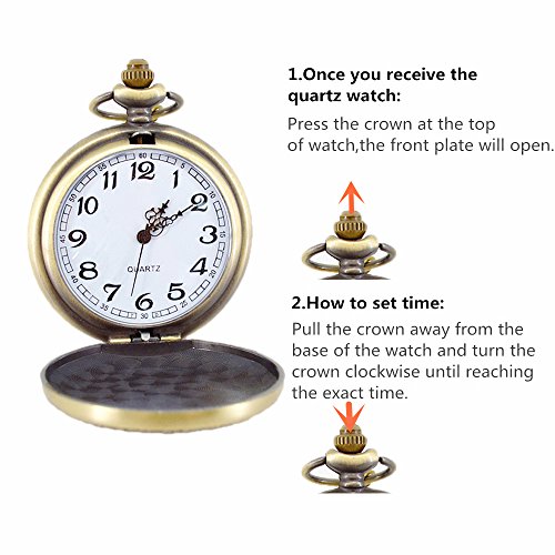 -. Feature : HIGH QUALITY: Made from high quality alloy external, with top glass back of the watch for view of precise quartz movement / SUITABLE SIZE: Pocket watch case diameter 1.81"(4.6cm). weigh 1.69oz(48g), Antique free chain length 15.74"(40cm) / KEEPING ACCURATE TIME: Easy setting, rotatting, twisting the top button on the spin, Modern quartz movement makes the watch a extremely accurate timekeeper / EXCELLENT DESIGN: Attractive vintage style design,good touch feeling, The bronzed finish and delicate-looking scrollwork give this pocket watch an authentic antique look / PERFECT GIFT: The quartz pocket watch movement comes with a REATR gift box, a nice present for Dad or birthday present or just for personal use
