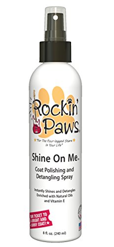 Studio : Rockin' Paws Publisher : Rockin' Paws Binding : Misc. Product Description Rockin' Paws SHINE ON ME Coat Polishing and Detangling Spray is specially formulated to give your four legged stars' coat a brilliant shine after and in between groomings-it's just the thing for those quick, and oh so necessary touch me ups in little time. Enriched with Jojoba and Avocado oils to soften and nourish, Shine On Me Coat Polishing Spray helps give you more ease in brushing or combing out mats, while providing your four legged star with a more gentle detangling. It's perfect for pre-bath brushing (detangling) and just as great for when you're in a rush and want to quickly primp your precious pet for that special occasion. Your four legged stars' coat will shine brilliantly and be ready for the spotlight with a great looking coat all day and all night! Instant shine and a smooth untangled coat are just a few sprays away with Rockin' Paws SHINE ON ME Coat Polishing and Detangling Spray. Just spray several even spritzes of Rockin' Paws SHINE ON ME Spray onto your pet's coat, avoiding eyes and mouth area. Comb, brush or smooth through with your fingers for an instantly soft, shiny and great smelling coat. For extra help with detangling, generously spray product directly on tangle or mat, and work in with fingers. Allow product to permeate on area for 1 to 2 minutes, then slowly and gently comb out tangle or mat, and finish off with a brushing. 0
