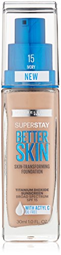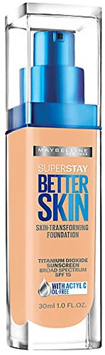Maybelline's foundation for better skin improves skin's look in just 3 weeks: reduces appearance of spots, bumps, dullness and redness. This healthy skin formula is our first all-day color wear with Actyl-C, known for its antioxidant benefits. • Oil-free, skin-transforming medium to full coverage foundation • Fade-proof and transfer-proof foundation for better skin • Longwear foundation with actyl-c and broad spectrum titanium dioxide sunscreen spf 15 • For healthy looking skin, dermatologist tested for safety Apply foundation onto skin and blend with fingertips or an applicator. Uses: Helps prevent sunburn if used as directed with other sun protection measures (see Directions). Decreases the risk of skin cancer and early skin-aging caused by the sun. Warnings: For external use only. Do not use on damaged or broken skin. When using this product, keep out of eyes. Rinse with water to remove. Stop use and ask a doctor if rash occurs. Keep out of reach of children. If swallowed, get medical help or contact a poison control center right away. Directions: For sunscreen use, apply liberally 15 minutes before sun exposure. Reapply at least every 2 hours. Use a water resistant sunscreen if swimming or sweating. Sun Protection Measures: Spending time in the sun increases your risk of skin cancer and early skin aging. To decrease this risk, regularly use a sunscreen with a Broad Spectrum SPF value of 15 or higher. Other sun protection measures include: Limit time in the sun, especially from 10 AM - 2 PM. Wear long-sleeved shirts, pants, hats, and sunglasses Avoid sun exposure for children under six months of age. Ask a doctor for any other information. Protect the product in this container from excessive heat and direct sun.Feature