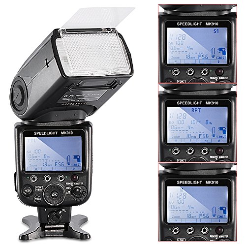 - Feature : Powerful Flash with High Guide No.60(ISO 100, 180mm). High-speed sync up to 1/8000th of a second. Flash Mode: TTL/M/RPT/HSS/MASTER/SLAVE/S1/S2;Support Front-curtain,Rear-curtain sync, FEB, FE Lock, AF assist beam, setting custom function, power saving mode,over heat protection, flash exposure compensation and memory function. / 35 pieces color gel filters for lighting effects and color correction. / The remote trigger for studio flashes and outdoor flash is used as the controller of synchronous trigger studio flash of cameras. It consists of a signal sender and a receiver trigger and works by means of the frequency modulation wireless remote control. / Kits include:(1)MK910 Flash+(1)Universal Mini Flash Bounce Diffuser Cap+(1)35-piece Color Gel Filters+(1)Flash Diffuser+(1)16 Channels Wireless Remote Flash Trigger+(4)LR Battery