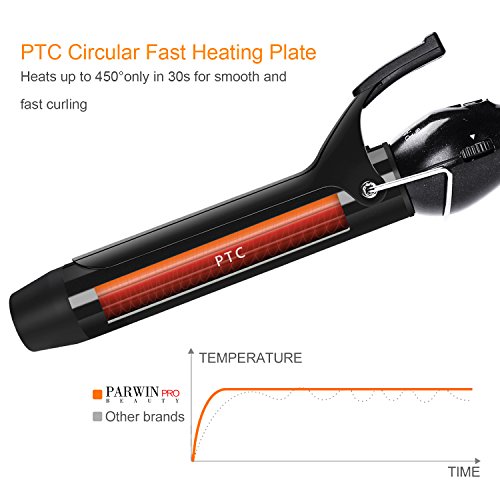The styler has on/off buttons and an on indicator light. Has a heat protective glove, tangle free swivel cord, a cool tip, so you can prevent burns. The most advanced professional styling tool ever. The tourmaline ceramic technology helps create shinier curls. The ceramic tourmaline barrel generates constant and even heat to create long-lasting, shiny curls. Digital Diamond Ceramic is a versatile 32mm curling iron. If it's gorgeous, straight or curly hair you or your customer prefer, you will be rewarded with a look that lasts all-day long without the need for chemicals to finish the job. The thin and light weight design fits in your hand comfortably, making the styling fun and easy. For All Hairstyles & Types Whether you sport a fine,normal or thick hairstyle, feel free to style it up with the ringlets you've always wanted. The curl ironing's wand is finely proportionate in order to turn long / short locks into either voluminous waves or tighter curls depending on the look you want. Frizz-Free Curls in Less Time The tourmaline ceramic coating releases negative ions that neutralize the positive charge of the hair in order to minimize frizz and hair damage. The PTC (Positive Temperature Coefficient) stones to the core of the wand heat up to 450 ℉ in only 60 seconds. Two Ways to Curl First Method: 1. Widen the clip and place the middle length of the lock in between the clip and the wand 2. Wrap the lock around the wand and close the clip Second Method: 1. Widen the clip and place the end of the lock in between the clip and the wand 2. Close the clip and wrap the length of lock around the wand The Parwin Pro Choice All Parwin Pro products come with a 12-month warranty, a 30-day refund guarantee, and exquisite after-sale support team to make sure you're fully satisfied with your purchase. What's In the Box: 1 x 32mm Professional Curling Iron 1 x Heat Resistant Glove 1 x User GuideFeature