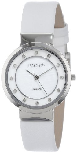 -. Binding : Watch -. Brand : Johan Eric -. Color : White/Mother of Pearl -. Department : womens -. EAN : 0846341092430 -. Feature : Quartz movement - Miyota 1N12 / Mother of pearl dial with 12 genuine diamond indexes / Second hand / White genuine leather strap / Water resistant to 99 feet (30 M): withstands rain and splashes of water, but not showering or submersion -. Label : Johan Eric -. Manufacturer : Johan Eric -. Model : JE6100-04-009L -. MPN : JE6100-04-009L -. PackageQuantity : 1 -. PartNumber : JE6100-04-009L -. ProductGroup : Watch -. ProductTypeName : WATCH -. Publisher : Johan Eric -. ReleaseDate : 2013-11-12 -. Size : Standard -. Studio : Johan Eric -. Title : Johan Eric Women's JE6100-04-009L Arhus Diamond Round Stainless Steel Mother-Of-Pearl Dial Watch -. UPC : 846341092430