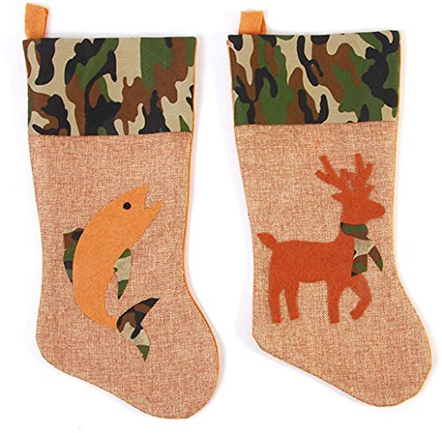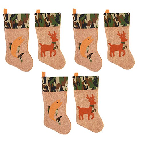 Holiday Christmas Burlap Fish & Reindeer 18" Stocking With Camouflage Cuff (Fish & Reindeer 6 Pack)